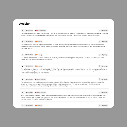 Set up your custom AI receptionist in minutes through our simple no-code dashboard.